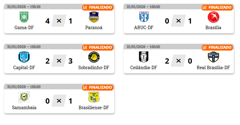 A próxima rodada do Candangão BRB 2026 acontece no fim de semana seguinte, com destaque para os confrontos entre Ceilândia e Capital, Gama e Sobradinho, além dos duelos decisivos na parte de baixo da tabela, envolvendo Brasília, ARUC, Samambaia e Real Brasília.